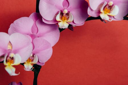 Orchid flowers on a red background with place for text.