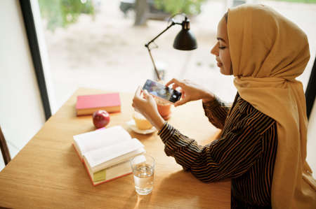 Arab girl makes photo of cup with coffee