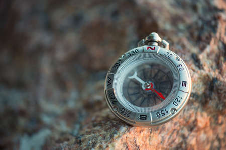 Magnetic silver compass on a background of greenery. The concept of travel, finding a way, vacation. Copy space