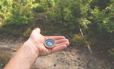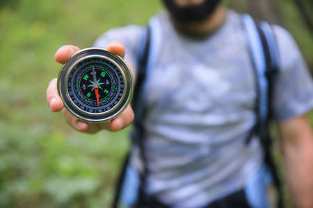 tourist holding a compass on the background of the forest