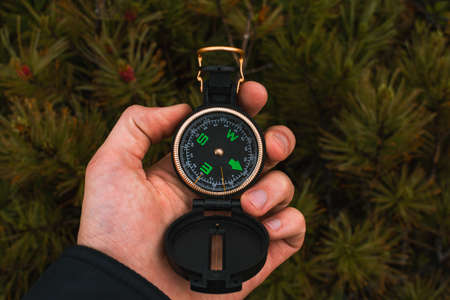Compass in hand at forest. Tourist compass for orientation on the terrain. magnetic declination calculator. Historical explorer help. Map reading and land navigation concept. Orient on maps