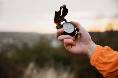 Man using compass for navigation during journey outdoors, closeup