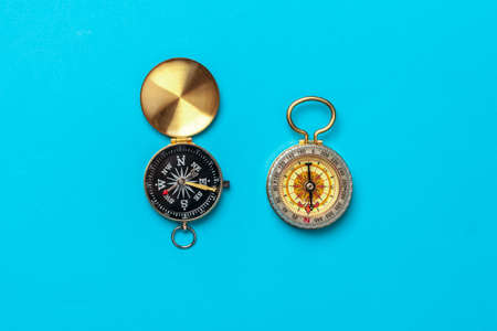 Modern nautical metal tourist compass on a blue background. travel or search concept