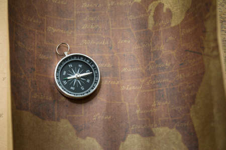 Compass and flag pins on blur vintage world map, journey concept, copy space
