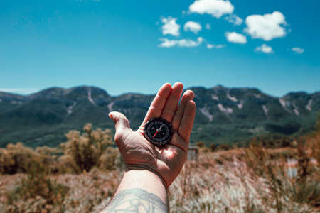 First-person view of a male travelers hand holding a magnetic compass against the backdrop of a mountainous area. Orientation and finding your way