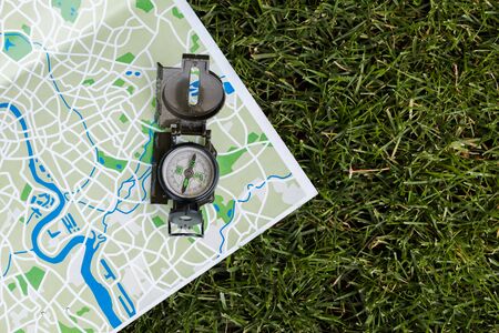 top view of vintage compass on map on grass