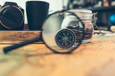 Compass look through a magnifying glass and money in glass jar on world map. ravel , Adventure and Discovery concept.