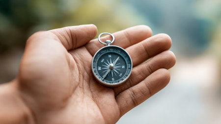 Close up of a campers hand gently holding a compass, providing a sense of direction and adventure during a summer camping trip amidst nature