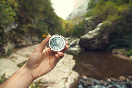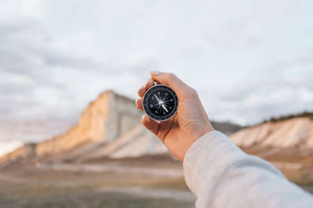 Traveler holding compass in hand for searching direction outdoor. Person use compass to find location mountain landscape
