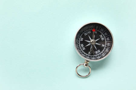 Tourist's compass on light blue background