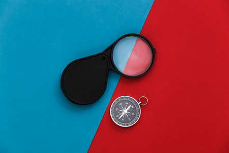 Compass and magnifying glass on red-blue background. Travel, adventure flat lay. top view