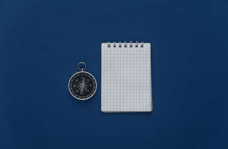 Travel planning or adventure. Compass with a notebook on classic blue background. top view