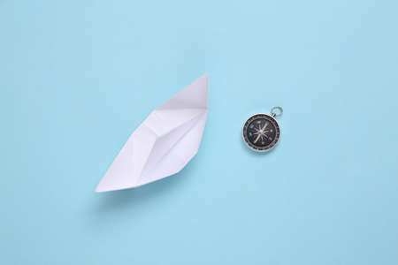 Navigation. Paper boat and compass on a blue background
