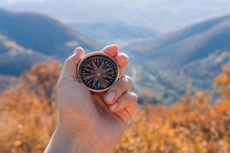 Female hand of traveler, hiker with compass on background autumn forest landscape with mountains on the horizon in orange colors in fall.
