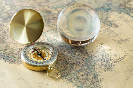 a globe and a compass in the hands of a person on the background of a geographical map of the world the concept of travel tourism