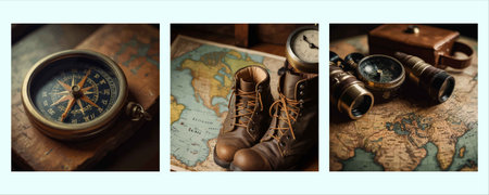 A flat lay composition featuring a vintage camera, a notebook with a pen, a compass, and a map, evoking a sense of adventure and exploration.