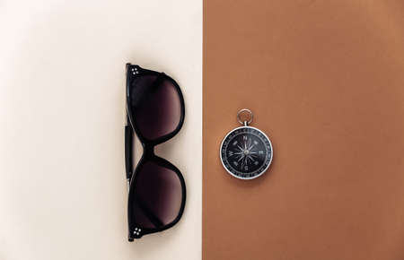 Minimalist travel flat lay. Compass and sunglasses on beige brown background. top view
