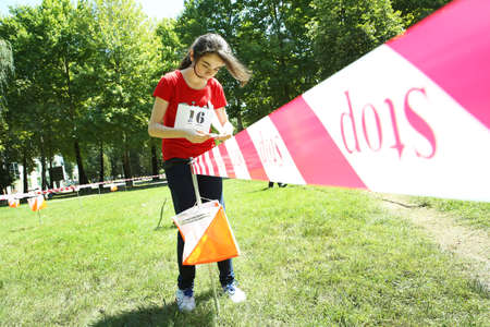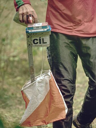 Village of Aktovo, Ukraine - May 21, 2021: Orienteering race. Traditional annual orienteering game Partisan Spark Cup 2021. Athlete marks the passage of the control point