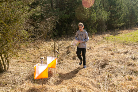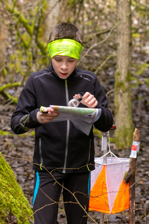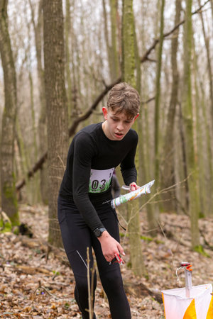 Grivki, Belarus - 26 March, 2023: Strong caucasian teenage boy wearing sportswear running through a forest during exercise in outdoor orienteering Grodno Forest Day. Belarus, hobby sport.