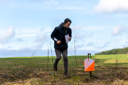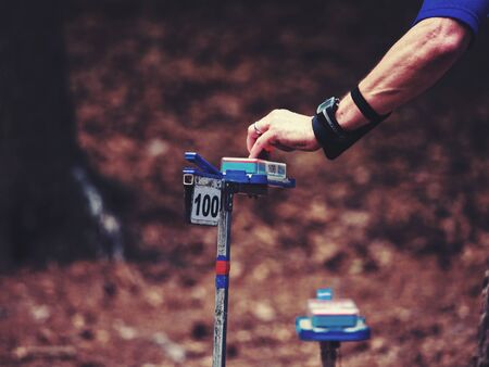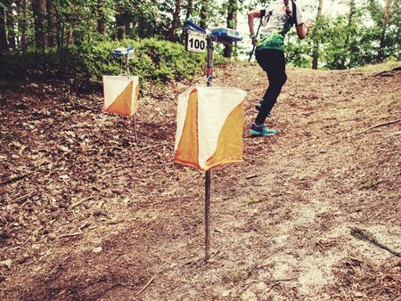 Person run hard to check point. Outdoor orienteering check point activity.