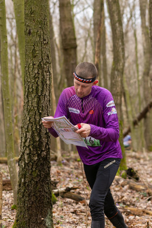 Village of Aktovo, Ukraine - May 21, 2021: Orienteering race. Traditional annual orienteering game Partisan Spark Cup 2021. Athlete during orienteering trail