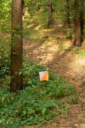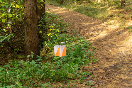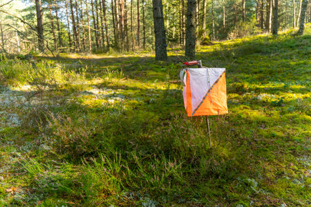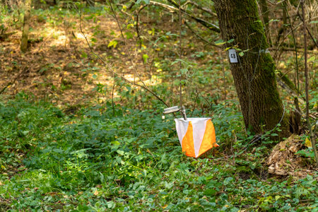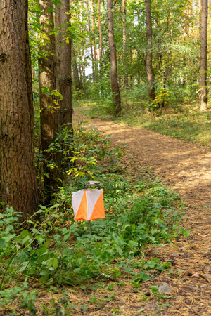 A prism marker and electronic composter at an orienteering control point in a sunlit pine forest. Outdoor sport, navigation, and eco-friendly concept.
