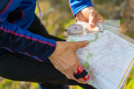 Compass in hand at forest. Tourist compass for orientation on the terrain. Magnetic declination Ñalculator. Historical explorer help. Map reading and land navigation concept. Orient on maps
