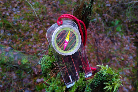 A magnetic tourist compass with a red lace and protective gloves lie in the forest on a log.