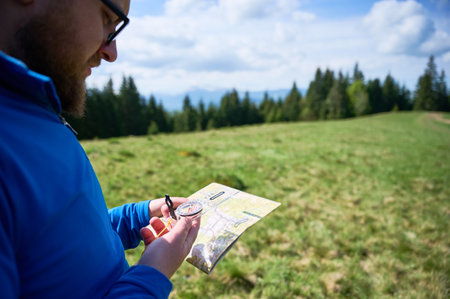 Man holds map and compass, standing in green field with trees and mountains in blurred background. Tourist looking intently at map, navigating through scenic landscape under partly cloudy sky.