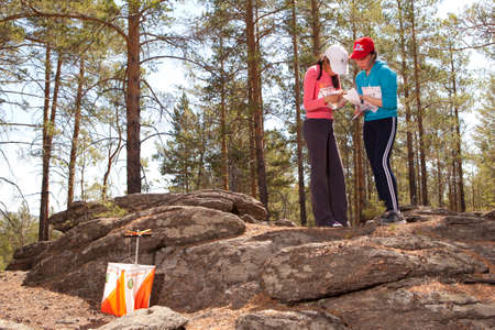 RUSSIA, ULAN-UDE - MAY 22, 2016: Russian Azimut - 2016. Orienteering competition is held annually in the Buryatia region. People at at control point at orienteering course.
