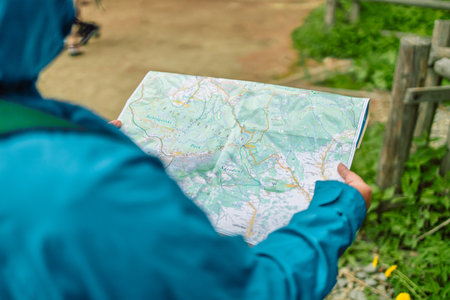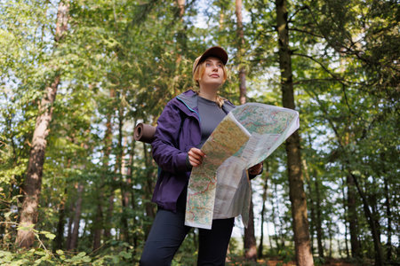 Active woman reading a map while taking a hiking break, having fun and relaxing while spending summer day outdoors, female traveler choosing best route for destination using map during journey in wild. High quality photo