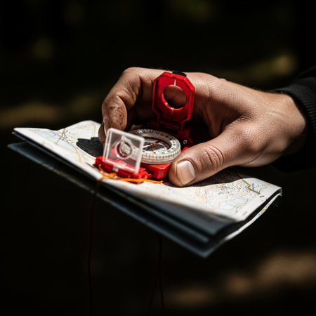 Person holds map and compass in green field. Scene features trees and distant mountains under partly cloudy sky. Focus on hands and navigation tools highlights act of orienting in nature.