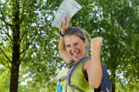 Smiling woman traveler holding paper map in forest with backpack