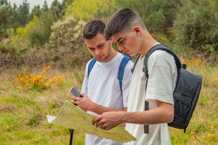 young people on a trip looking at the map
