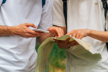 hands of travelers with mobile phone and map