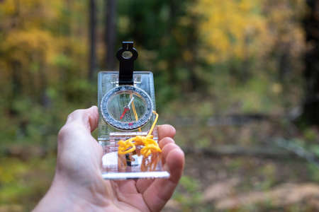 tourist holding a compass on the background of the forest