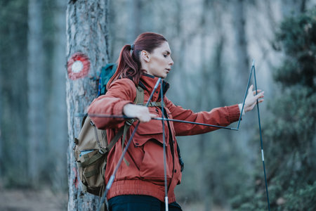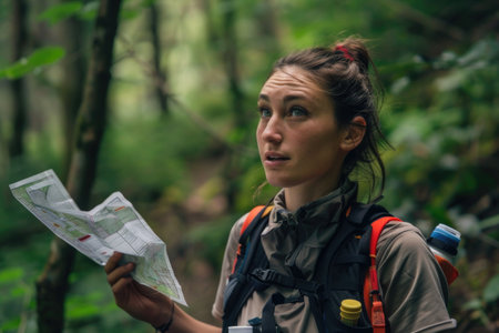 Woman hiking with map in lush forest, exploring nature and navigation skills