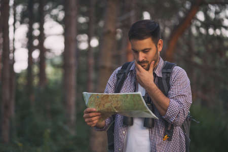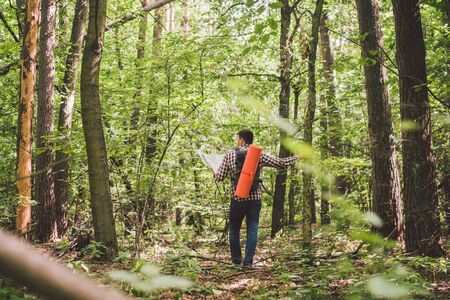 Man with Backpack and map searching directions in wilderness area. Tourist with backpack using map in forest. concept tourism holidays. Hiking man. Traveling man lost walking in forest looking at map.