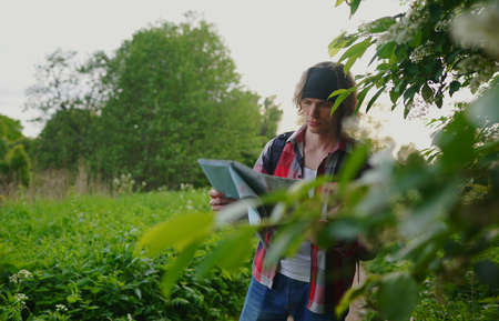 Man traveler read the map among the green summer nature
