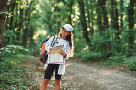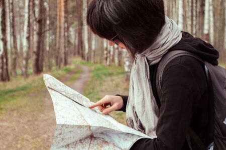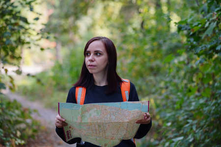 Using the map. Girl is in the forest at summer day time discovering new places.