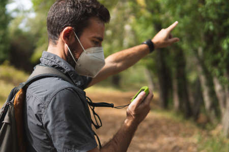 Man looking at the GPS pointing out the direction of the right route while hiking in the mountain with a mask on the covid-19. Concept of sport.