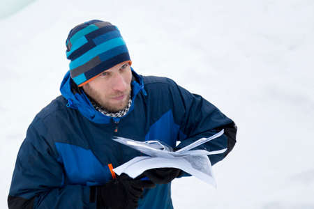 A closeup shot of two people holding and reading a map in a snowy area