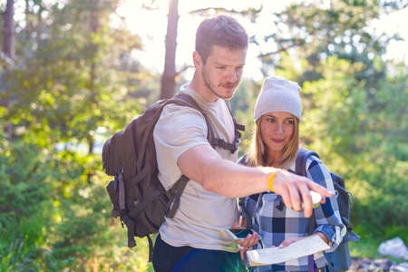 Young couple examining the map inside the forest. Hiking concept in the mountain in summer