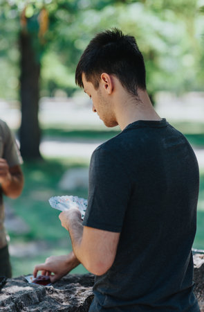 Young man playing cards outdoors in a park setting