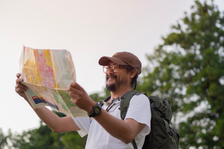 Smiling adult man traveler in nature park in Thailand holding world map with backpack on holiday, relaxation concept, travel concept