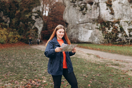 blonde hiker with compass and reading map in the nature