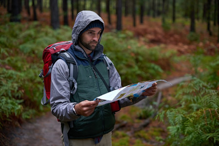 Adult man is hiking in forest. He is looking at map.