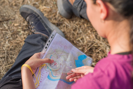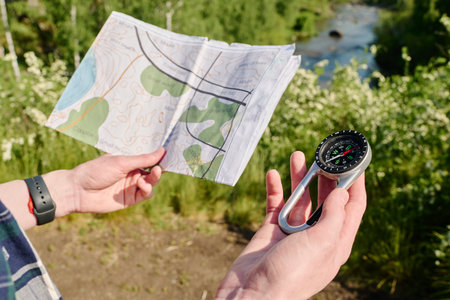 Compass and local map in hands of young unrecognizable female hiker or camper standing in natural environment during trip