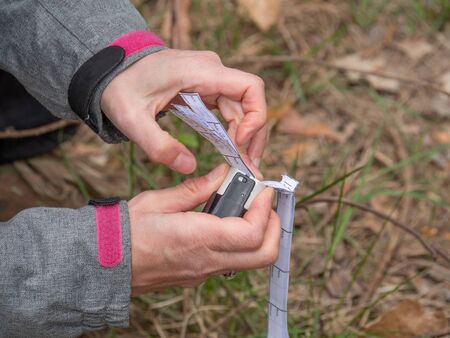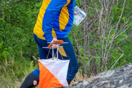 Yuzhnoukrainsk, Ukraine - May 26, 2018: Orienteering. Traditional annual orienteering game Partisan Spark Cup 2018. The athlete marks the passage of the control point