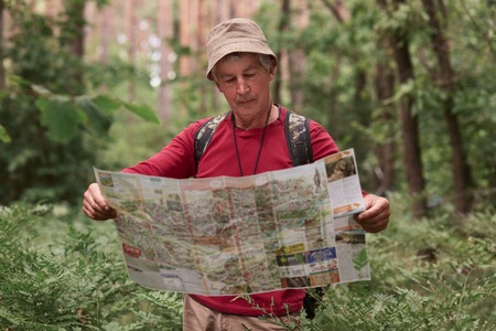 Man with backpack, wearing red casual sweater and hat reading map in woods. Elderly male have lost in forest, tries to find way, has adventure while traveling. Active vacation and backpacking concept.